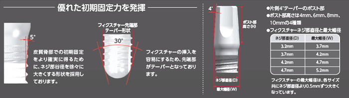 当院で主に採用している京セラの1ピースタイプのインプラントは、多く行われている2ピースタイプのものと異なり、2次手術が不要で1回の手術で植立する事が出来、またハイドロキシアパタイトコーティングの効果で、比較的短時間で歯槽骨との結合が得られる優れたインプラントです。